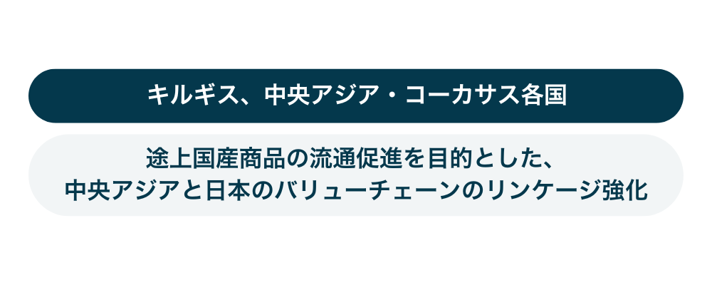 共創テーマ、民間セクター、アジア、キルギスタン途上国産商品の流通促進を目的とした、中央アジアと日本のバリューチェーンのリンケージ強化 Posted on 2026年2月11日2026年2月23日 by admin 課題:キルギスを中心に近年面的拡大を図ってきた一村一品プロジェクトでは、地元の素材を使った特産品の開発・改善を支援し、国内外の市場で特産品の流通を図り、地方部の雇用創出や所得向上に取り組… 続きを読む →